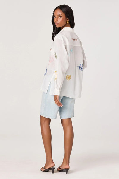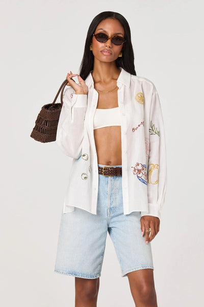 Hey Babe, Playful embroidery brings this oversized button-down to life with charming picnic-themed artwork. Each colorful stitch celebrates carefree style, turning an everyday classic into a conversation-starting piece that radiates fun and individuality.