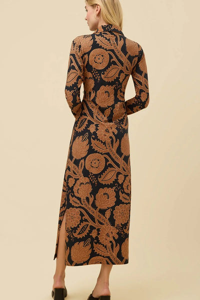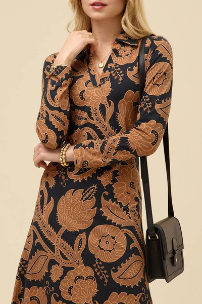 Hey Babe, The Celia Midi Dress showcases a charming black and brown Guerard Estate vine print, perfect for effortless style every day. Made from soft, breathable Peruvian cotton, it features long sleeves, a collared V-neck, and a side slit to keep you comfortable on the move. Slip it on with black boots or loafers for a playful yet polished look. A timeless neutral staple you'll wear on repeat.