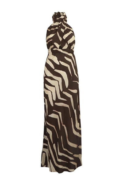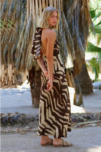Hey Babe, Let this dress make the statement. Our Halter Wrap Maxi features a waist-cinching wrap and neck tie that create an undeniably flattering silhouette with zero effort. Crafted from luxurious 100% viscose in a bold zebra print, it drapes with fluid elegance while the daring open back and halter neckline keep things fun and flirty. Unapologetically bold. Refreshingly free-spirited. A dress that leaves an impression.