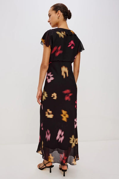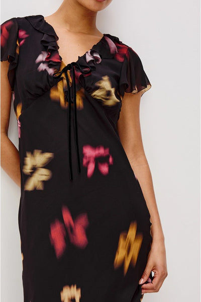 Hey Babe, Dreamy and utterly charming, the Neela Dress captures that perfect blend of whimsy and elegance. Soft, watercolor florals dance across lightweight chiffon while a sweet velvet bow adorns the ruffled V-neckline. Delicate ruffle cap sleeves add a touch of playfulness, while the empire waist creates a flattering, graceful flow that skims beautifully to a midi hem.