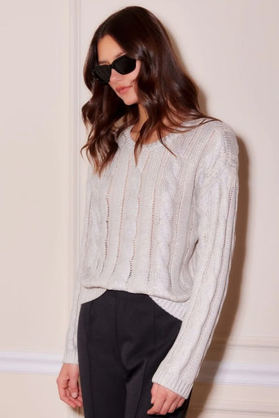 Hey Babe, A silver metallic cable knit sweater that's equal parts cozy and glamorous. The open-stitch design shimmers beautifully, while the relaxed fit and split neckline keep things effortless. Perfect for dressing up or down.