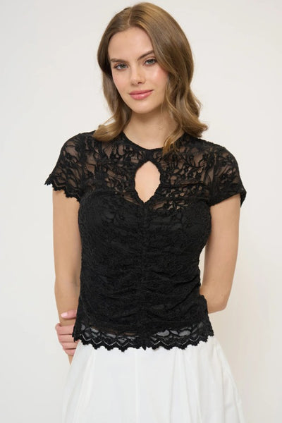 Hey Babe, Meet your new go-to for effortless charm. This darling top layers delicate lace with flattering ruching that hugs in all the right places. The sweet keyhole neckline is just the right amount of flirty, and those scalloped edges? Pure romance. Whether you're dressing up or keeping it casual, this piece brings instant personality to any outfit.