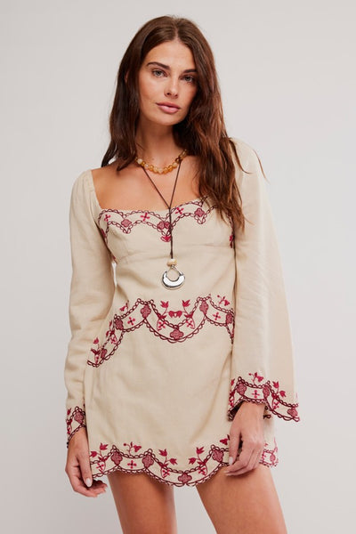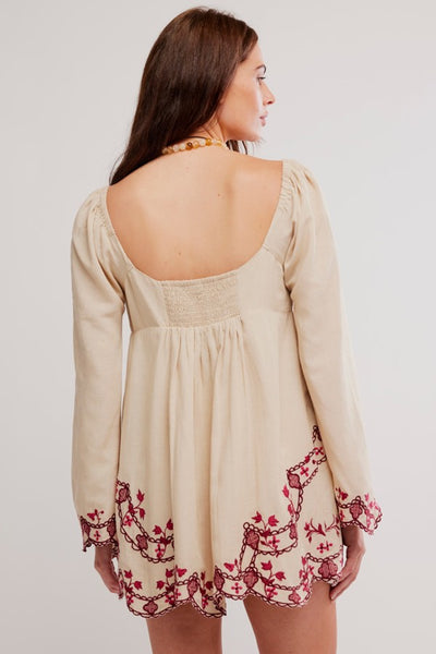 Hey Babe, Escape to island vibes with the Bali Marlene Mini Dress, your new go-to for effortless boho style. This relaxed beauty features a charming square neckline, scoop back neckline with a little ruching for just the right fit, delicate scalloped edges on the hem and sleeves, and intricate embroidery that whispers tropical romance. Pair it with your favorite sandals or slides for a laid-back look that feels like a permanent vacation.