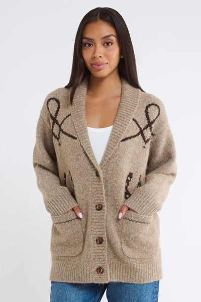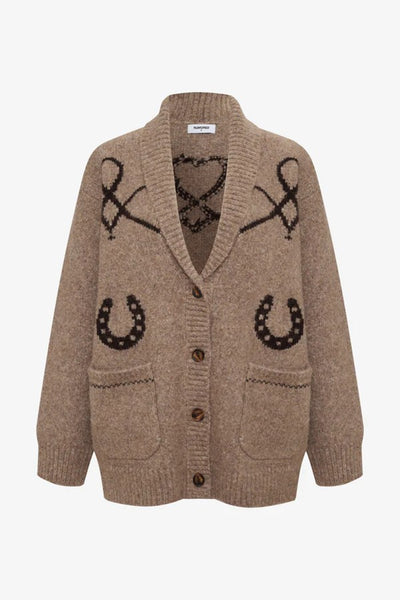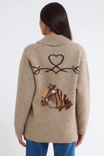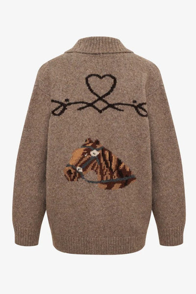 Hey Babe, This jacquard-knit cardigan channels ’70s Western vibes with its playful equestrian motifs. Featuring chore pockets and a cozy shawl collar, it blends ranch-ready style with a retro flair—like a treasured find from your hip aunt’s wardrobe.