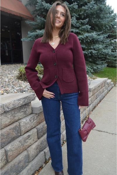 Hey Babe, Layer up with the Aeron V-Neck Cardigan—your new go-to for effortless style. This beauty rocks a flattering V-neck and relaxed silhouette that works solo or paired with your favorite pieces. The classic button-front design never goes out of style, while the sumptuous yarn blend keeps things cozy and soft. In rich claret, it's the kind of deep burgundy that whispers sophistication without trying too hard.