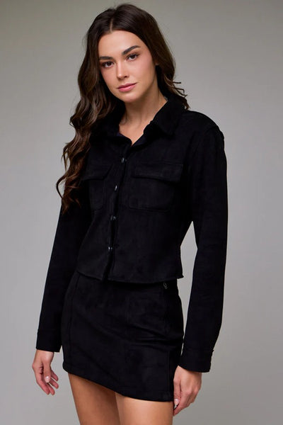 Hey Babe, Turn heads in this cropped black suede button-up that screams confidence and contemporary cool. The intentionally shortened silhouette delivers that edgy aesthetic you're after, while the flexible polyester and spandex blend moves with your body without sacrificing that plush suede luxury. Your new favorite piece for standing out and owning every moment.