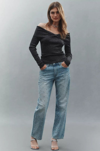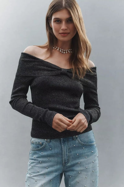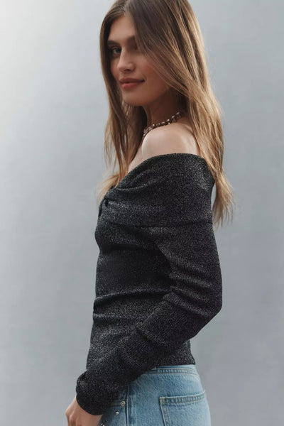 Hey Babe, This refined top showcases an elegant off-shoulder silhouette accented with a sophisticated folded detail. The luxurious ribbed knit fabric delivers a subtle shimmer while providing gentle stretch for all-day comfort. Its tailored slim fit gracefully complements your natural contours, making it an effortless choice for any occasion.