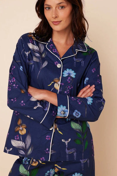 Long-sleeved pajama top and full length pant with pockets. Contrast piping and drawstring