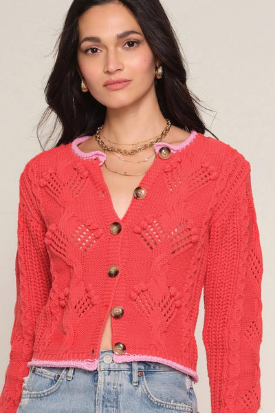 Hey Babe, Wrap yourself in the Elaya Cardi—where comfort gets a style upgrade. This red cable knit beauty boasts a breezy, over-sized fit and a generous round neck that feels as good as it looks. Pop the buttons, layer it over anything, and let the chunky knit texture and textured hem do the talking. Your new go-to piece for effortless, cozy vibes.