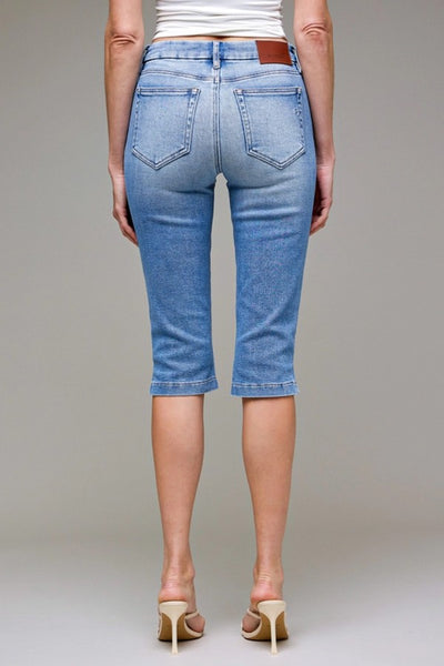 Features to note: Flattering slim capri silhouette, Mid-rise waist for comfortable everyday wear, Soft stretch denim for flexible movement, Light vintage wash with subtle fading, Side slit hem detail for a modern finish, Classic 5-pocket denim styling, Cropped length perfect for spring and summer outfits