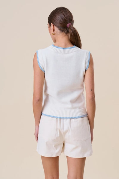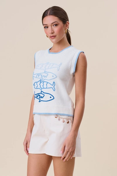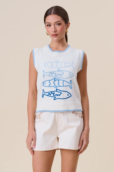 Hey Babe, Dive into coastal charm with this whimsical knit vest, adorned with cheerful blue sardine embroidery. Perfect for layering over your favorite tees or dresses, it brings a playful, ocean-inspired personality to any warm-weather look. The lightweight construction keeps you comfortable while the quirky design sparks conversation. A fun, unexpected piece that celebrates seaside style with a wink and a smile.
